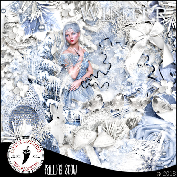 Chili's newest kit "Falling Snow" is a beautiful kit with all the hallmarks of a classic winter palette of ice blue and frost white with accents of silver, pale blue, midnight and pine. It has 10 papers, 8 frames and 80 elements with lots of variety for your winter tagging needs. This kit is available here!