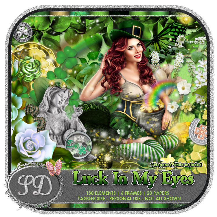 Feeling lucky? Then don't hesitate to grab Savage Dezines' beautiful kit Luck In My Eyes. This great kit is made for St. Patrick's Day but it is also a great spring kit as well. Its palette comes in kelly green and shining gold, with accents of pewter, ice green and yellow. It contains 20 papers, 6 frames and over 130 elements, as well as a gorgeous tube by Attila.