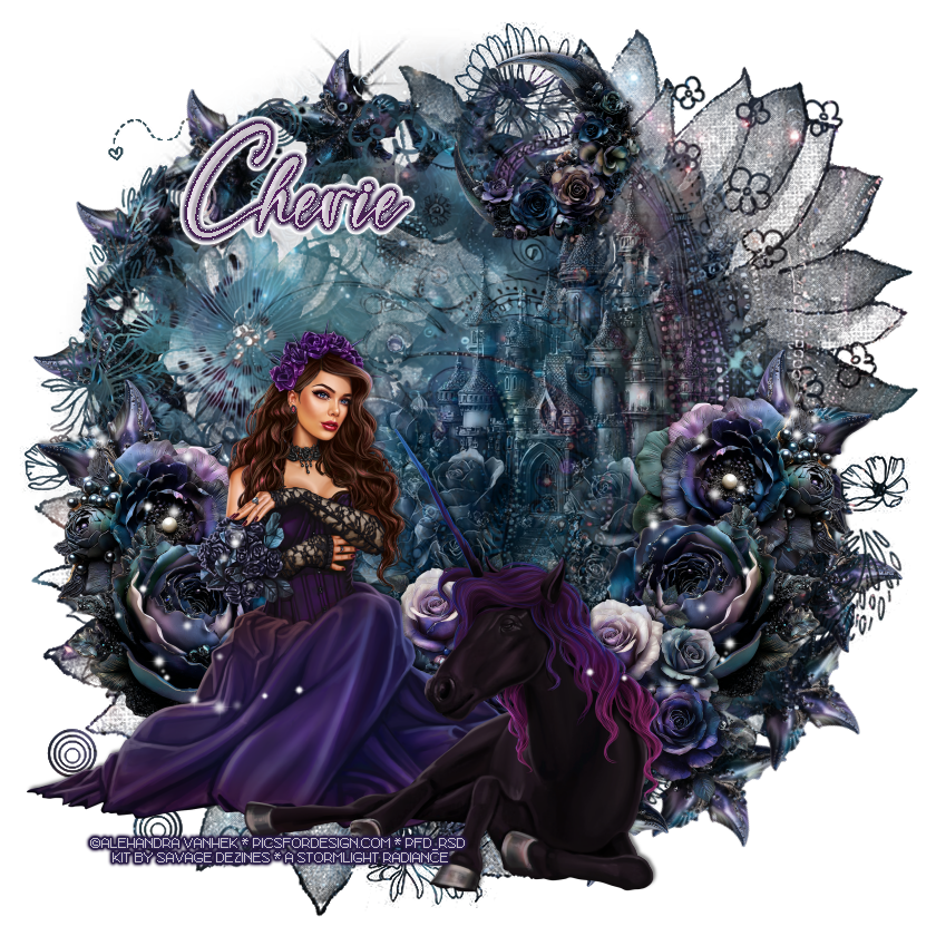 Savage Dezines' Black Unicorn kit is a gorgeous gothic kit, great for Halloween or every day gothic designs. This stunning kit is made to match Alehandra Vanhek's tube of the same name and has 16 papers, 4 frames and over 80 elements in a darkly beautiful palette of deep violet, onyx, steel blue and ivory, with accents of lavender, pale roses and blues. [This kit contains AI items.]