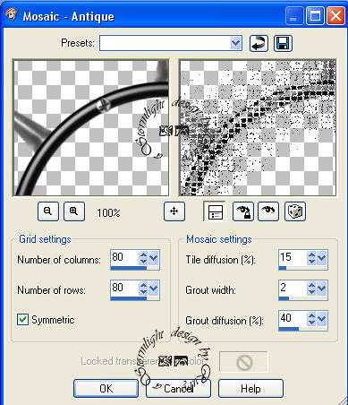 8. Duplicate frame layer, drop this under tube layer. Go to effects > texture effects > antique mosaic with the following settings: